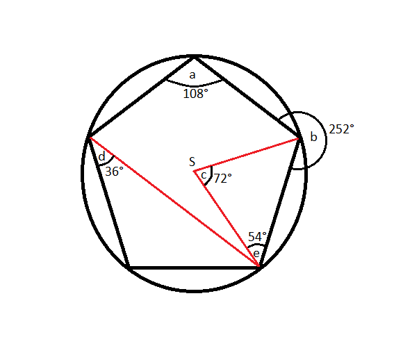 Miara kąta b to kąt pełny bez jednego kąta wewnętrznego pięciokąta, czyli b = 360° - 108° = 252°.