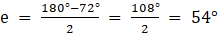 Kąt e to kąt przy podstawie trójkąta równoramiennego o jednym z kątów równym 72°. Ma on miarę