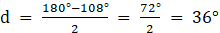 Kąt d to kąt przy podstawie trójkąta równoramiennego o jednym z kątów równym 108°. Ma on miarę