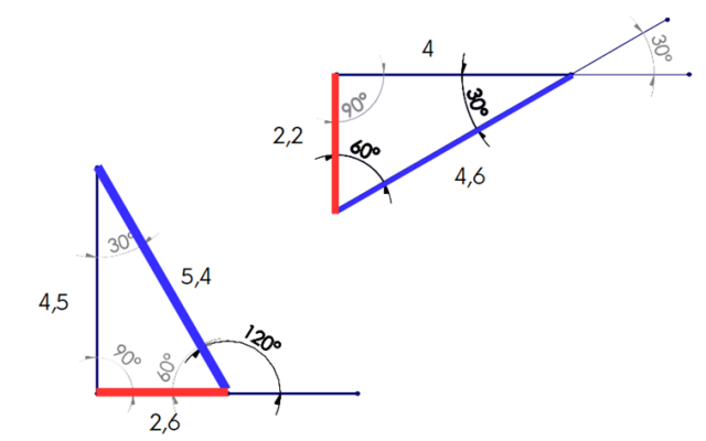 Przy pierwszym trójkącie kąt 60° i 120° tworzy kąt przyległy.