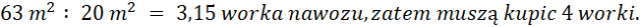 Odp. Państwo Kowalczykowie muszą kupić 4 worki nawozu, za co zapłacą 46 zł.