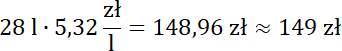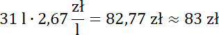 Na początek pomnóż ilość każdego paliwa przez jego cenę za litr. Następnie przyjrzyj się pierwszej cyfrze po przecinku i zaokrąglij cenę w dół, jeżeli jest to cyfra 0, 1, 2, 3 lub 4, albo zaokrąglij w górę, jeżeli cyfra części dziesiątych jest większa od 4.