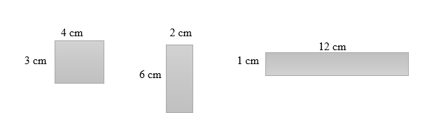 Mając podaną jednostkę, wyznacz prostokąty tak, aby ich pole wynosiło dokładnie 12 cm2.
