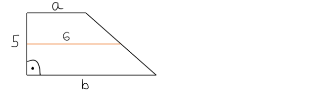 Wiedząc, że wysokość jest równa 5, a odcinek łączący środki ramion trapezu wynosi 6, oblicz pole podstawiając do wzoru .