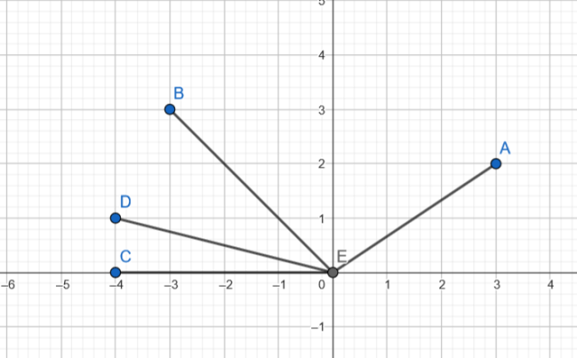 Zaznacz każdy z punktów na rysunku pomocniczym i sprawdź, który ma najmniejszą odległość do punktu (0, 0). Długość CE oblicz, licząc kratki, a długość DE, BE i AE z Pitagorasa.