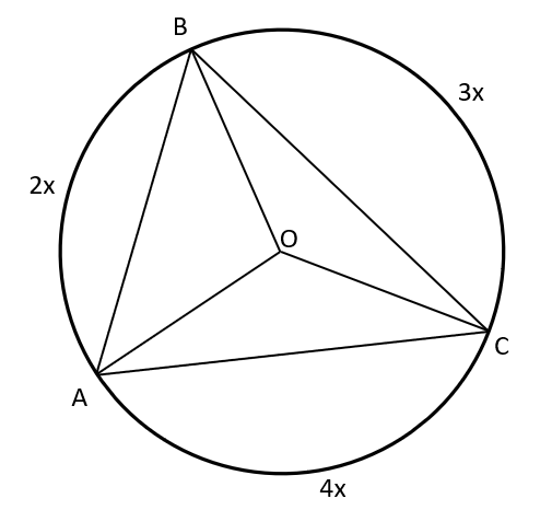 Stosunek długości łuku do długości całego okręgu jest równy stosunkowi miary kąta, na którym ten łuk jest oparty do miary całego okręgu. Dzięki tej zależności możesz wyznaczyć miary kątów środkowych opartych na bokach trójkąta, z których następnie możesz wyliczyć wartości kątów wpisanych, które są kątami wewnętrznymi trójkąta.