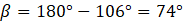Kąt β jest kątem wierzchołkowym z kątem o mierze 34°, więc kąt β również ma miarę 34°. Kąt α jest stanowi z kątem 106° parę kątów przyległych, których suma jest równa 180°.