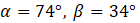 B. α = 74°, β = 34°