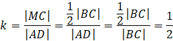 Skalą podobieństwa trójkątów jest stosunek długości odpowiadających sobie boków MC i AD. |MC| jest połową |BC|, a |AD| = |BC|, ponieważ długości boków równoległoboku są parami równe. Stosunek pól trójkątów równy jest skali ich podobieństwa podniesionej do kwadratu.