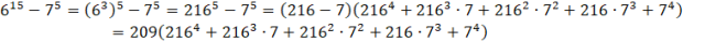 Liczbę można 615 - 75 można przedstawić w postaci iloczynu 209 i liczby całkowitej, więc jest ona podzielna przez 209.