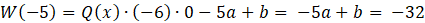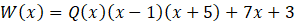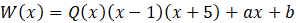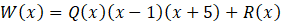 Korzystając z twierdzenia o rozkładzie wielomianu zapisz wielomian W(x) jako W(x) = Q(x)(x – 1)(x + 5) + R(x), przy czym R(x) jest wielomianem stopnia co najwyżej pierwszego. Następnie do tak zapisanego wzoru podstaw wartości 1 oraz -5, wyznaczając tym samym wyrażenia opisujące reszty z dzielenia W(x) odpowiednio przez x – 1 oraz x + 5. Przyrównaj otrzymane reszty do tych podanych w treści zadania, tworząc w ten sposób układ równań z niewiadomymi a i b. Rozwiąż układ i dzięki jego rozwiązaniom zapisz wzór opisujący R(x).