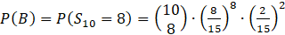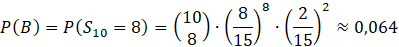 B — zdarzenie: wylosowano dwie kule w różnych kolorach 8 razy