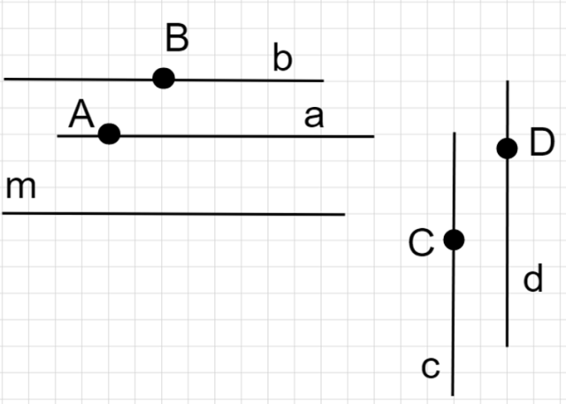 Musisz za pomocą linijki i ekierki narysować prostą m i 4 punkty, przez które będą przechodzić proste równoległe (a i b) i równoległe (c i d) do prostej m.