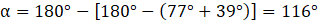 Kąt α wraz z drugim tworzą kąt przyległy, którego suma to 180°. Suma wszystkich kątów wewnętrznych trójkąta to również 180°. Tak, więc: