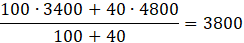 Oblicz średnią zarobków w pewnej firmie, wiedząc, że w oddziale A pracuje 100 osób, a w oddziale B – 40 osób oraz średnie wynagrodzenie w tych oddziałach wynosi odpowiednio 3400 zł i 4800 zł