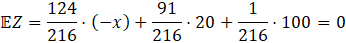 Mając te wszystkie informacje podstaw je do wzoru na wartość oczekiwaną, przyrównaj to wyrażenie do 0 i oblicz x. Pamiętaj, że stratę zapisuj jako ujemną wygraną. Aby pozbyć się ułamków warto przemnożyć obie strony równania przez wspólny mianownik, czyli 54. To zadanie możesz także zrobić korzystając z metody drzewka.