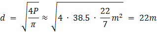 Oblicz długość średnicy rabaty, jeśli jej powierzchnia w kształcie koła jest równa powierzchni prostokątnego trawnika o bokach długości 5,5 m i 7 m.