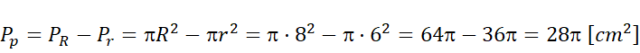 Wyznacz pole powierzchni pierścienia kołowego, którego wymiary przedstawiono na rysunku, przyjmując, że .
