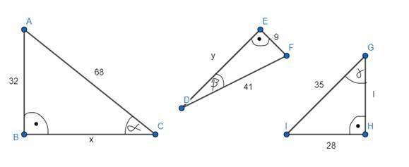Zacznij od skorzystania z twierdzenia Pitagorasa w każdym z trójkątów, aby obliczyć długości odcinków x, y i l. Następnie oblicz wartości funkcji trygonometrycznych dla każdego z kątów.