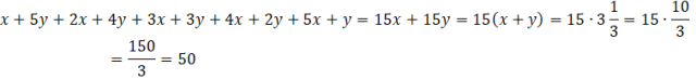 W tym zadaniu musisz dodać wszystkie x do siebie i y do siebie. Następnie musisz wyłączyć wspólną liczbę przed nawias i skorzystać z tego, że znana jest wartość sumy x i y, aby obliczyć szukaną wartość.