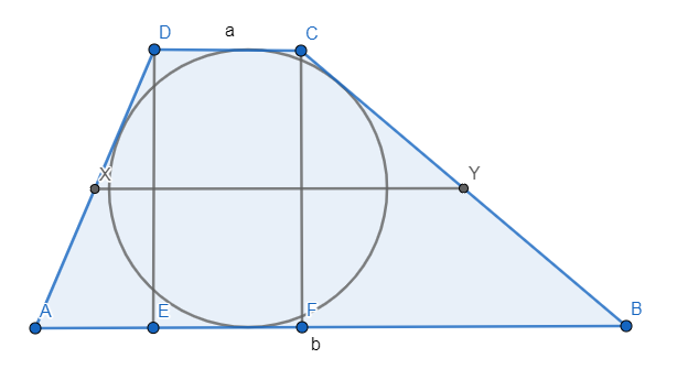 W tym zadaniu musisz obliczyć obwód trapezu opisanego na okręgu. Odcinek łączący środki boków nierównoległych tego trapezu ma długość 8.