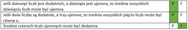 | Jeśli dziewięć liczb jest dodatnich, a dziesiąta jest ujemna, to średnia wszystkich dziesięciu liczb może być ujemna. | P | F |