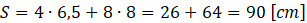 W graniastosłupie prawidłowym czworokątnym pole powierzchni bocznej wynosi 208 cm², a pole powierzchni całkowitej wynosi 336 cm². Ustal, ile wynosi łączna długość wszystkich krawędzi tej bryły.