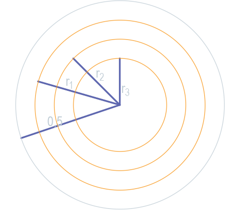 Dany jest tarcza, której średnica wynosi 1 m. Tarcza została podzielona tak, że każde z pól jest takie samo. Podaj promienie tych okręgów.
