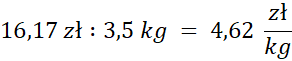 Podziel cenę przez 3,5 kg, żeby obliczyć cenę za kg.