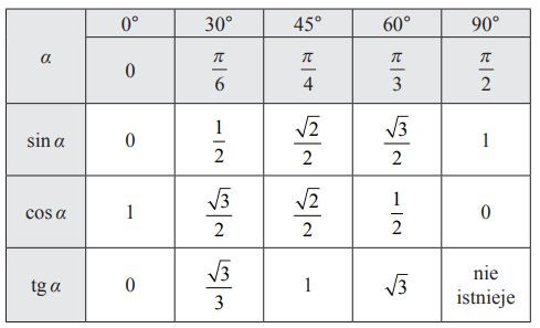 Wypisz wartości sinusów dla kątów szczególnych na podstawie tabelki z tablic matematycznych.