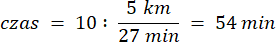 Pani Iza przebiegła dystans 5 kilometrów. Zajęło jej to 27 minut. Sprawdź, czy przebiegnie 10 kilometrów w czasie 54 minut, czy zajmie jej to dłużej, czy krócej.