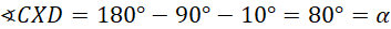 Wyznacz kąt CXD, korzystając z miar kątów w trójkącie CDX i oznacz go jako α.
