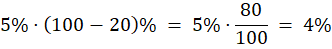 Najpierw oblicz nowe oprocentowanie. W tym celu oblicz, jaka liczba jest o 20% mniejsza od 5% - pomnóż 5% razy (100 – 20)%. Następnie oblicz różnicę między starym a nowym oprocentowaniem i podaj ją w punktach procentowych.