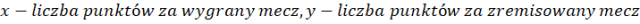 Przez x oznacz liczbę punków za wygrany mecz, a przez y – za zremisowany. Utwó®z układ dwóch równań, a na podstawie treści zadania i wyznacz z niego zmienną x.