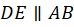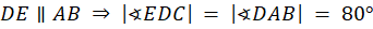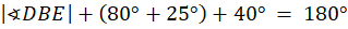 Skorzystaj z sumy kątów wewnętrznych w trójkącie ACB, aby policzyć miarę kąta CBA, następnie zauważ, że skoro proste DE i AB są równoległe, to kąty EDC i DAB mają równe miary (kąty odpowiadające). Kolejno skorzystaj z sumy kątów w trójkącie DBC, aby policzyć kąt DBE (DBC).