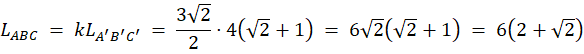 Wyznacz skalę podobieństwa trójkąta ABC do trójkąta A’B’C’, a następnie oblicz obwód drugiego z nich. Aby obliczyć obwód trójkąta ABC musisz przemnożyć skalę (k) przez obwód drugiego wielokąta.