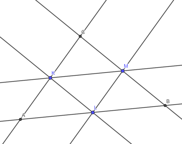 W tym zdaniu trzy proste przecinają się parami w punktach K, L, M. Narysuj proste równolegle do danych prostych, przechodzące przez punkty K, L, M. Nazwij otrzymane punkty przecięcia prostych. Wypisz pary odcinków równoległych.