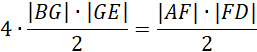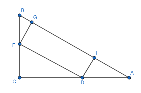 Punkty D i E są środkami przyprostokątnych AC i BC trójkąta prostokątnego ABC. Punkty F i G leżą na przeciwprostokątnej AB, przy czym odcinki DF i EG są do niej prostopadłe (zob. rysunek). Musisz obliczyć pole trójkąta ABC, znając pole trójkąta BGE i pole trójkąta AFD.