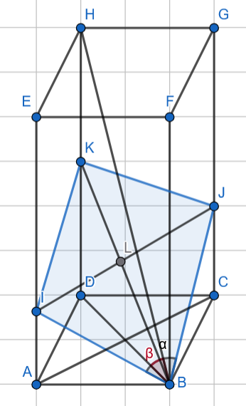 Oblicz cosinus kąta nachylenia płaszczyzny przekroju do płaszczyzny podstawy prostopadłościanu, jeśli prostopadłościan o podstawie kwadratowej przecięto płaszczyzną przechodzącą przez jeden z wierzchołków podstawy. W przekroju otrzymano romb o kącie ostrym .