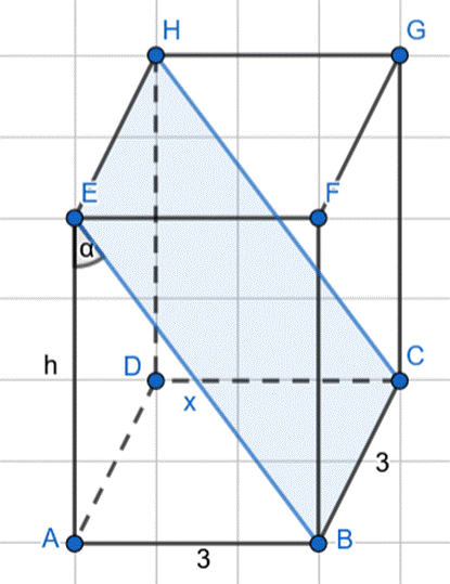 Wyznacz pole przekroju, jeśli graniastosłup prawidłowy czworokątny o krawędzi podstawy 3 cm przecięto płaszczyzną zawierającą przeciwległe krawędzie jego podstawy, a otrzymany przekrój tworzy z jedną ze ścian bocznych kąt taki, że .
