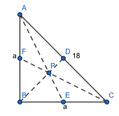 Wyznacz sumę odległości punktu P od wierzchołków tego trójkąta, jeśli dany jest trójkąt prostokątny równoramienny o przeciwprostokątnej długości 18 cm. Środkowe tego trójkąta przecinają się w punkcie P.