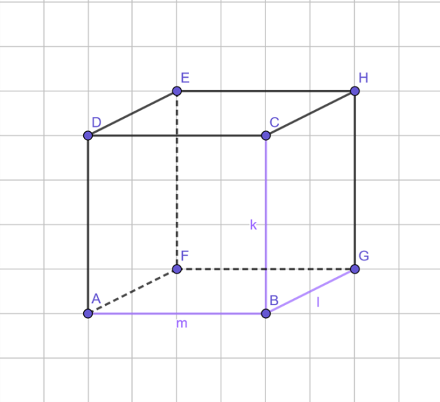 Mając dane dwie krawędzie k i m sześcianu oraz wiedząc, że k ⊥ m, określ krawędź l prostopadłą do m oraz mającą punkt wspólny z k. Narysuj ten sześcian.