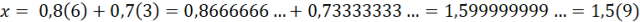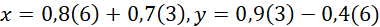 Oblicz x dodając do siebie ułamki okresowe. Pamiętaj, aby dodawać cyfry na odpowiadających sobie miejscach po przecinku. Jak już obliczysz x oraz y, zauważ, że x jest większy od 1, a y nie (coś od czegoś mniejszego od 1 jeszcze coś odejmujemy). Zatem x jest na pewno większy od y.