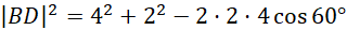 Wykorzystaj twierdzenie cosinusów i oblicz długość przekątnej BD: