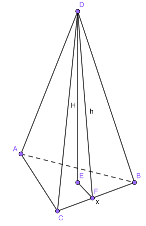Stwórz rysunek pomocniczy, gdzie x to krawędź podstawy, H to wysokość ostrosłupa, a h to wysokość ściany bocznej: