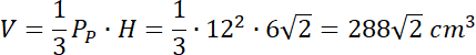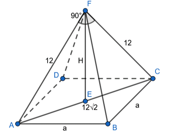 Wyznacz objętość ostrosłupa prawidłowego czworokątnego, w którym kąt między przeciwległymi krawędziami bocznymi jest równy 90°, a krawędzie boczne mają długość 12 cm