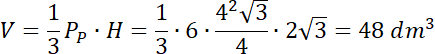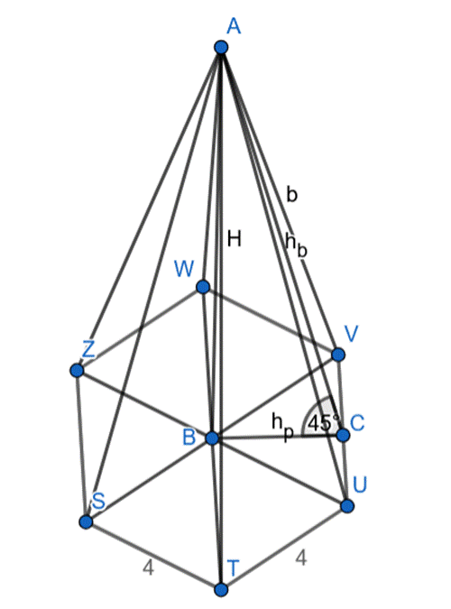 Wyznacz objętość tego ostrosłupa prawidłowego sześciokątnego, którego krawędź podstawy ma długość 4 dm, a kąt między ścianą boczną i płaszczyzną podstawy jest równy 45°.