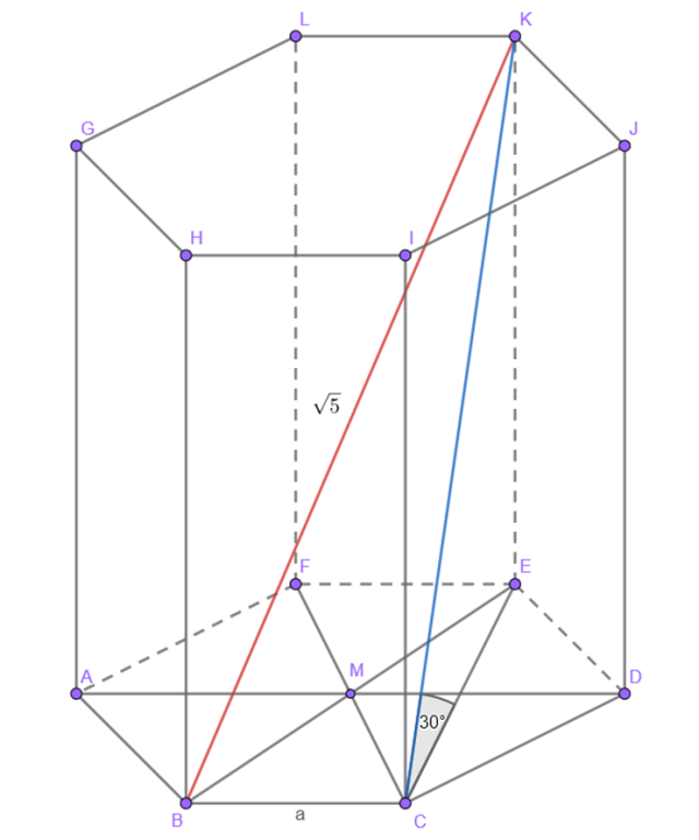 Mając dany sześciokąt foremny, który jest podstawą graniastosłupa prostego oraz wiedząc, że krótsza przekątna bryły tworzy z podstawą kąt 30°, a dłuższa jest równa