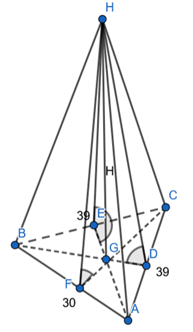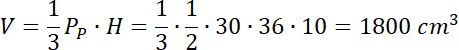 Wyznacz objętość ostrosłupa, którego podstawą jest trójkąt, którego dwa boki mają długość 39 cm, długość trzeciego boku wynosi 30 cm, a każda ściana boczna tworzy z płaszczyzną podstawy kąt 45°.