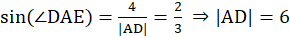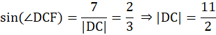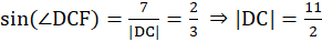 Poprowadzimy obie wysokości z wierzchołka D. Pierwsza przecina bok |AB| w punkcie E (|DE| = 4), a druga bok |BC| w punkcie F (|DF| = 7). Obliczyć sinus kąta ostrego tego równoległoboku przy użyciu trójkąta CDF: